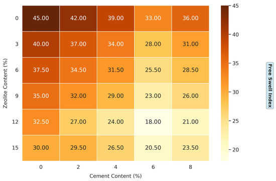 Figure 4 illustrates the effects of varying cement and zeolite content on the soil’s free swell index (FSI). It displays a comprehensive matrix of cement percentages (0%, 2%, 4%, 6%, and 8%), while different zeolite content (0%, 3%, 6%, 9%, 12%, and 15%) is represented by contour plots. This experimental design thoroughly examines how these two admixtures, in combination, influence the soil’s swelling behavior. The results demonstrate that cement and zeolite significantly impact the reduction in the FSI of the soil. For the untreated soil (0% cement, 0% zeolite), the FSI is approximately 45, indicating a high swelling potential that could lead to structural instability in construction projects. The combined effect of cement and zeolite on FSI reduction is even more pronounced. For instance, at 6% cement and 12% zeolite, the FSI plummets to approximately 18. This synergistic effect can be attributed to several factors. First, both admixtures provide calcium ions that promote cation exchange and flocculation [14]. Second, zeolite’s pozzolanic properties allow it to react with the calcium hydroxide (Ca (OH)2) produced during cement hydration, forming additional C-S-H gels. This supplementary cementitious reaction enhances the soil’s strength and reduces its tendency to swell [12].