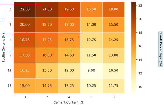 Figure 5 presents a comprehensive dataset on the effects of varying cement and zeolite content on the swell percentage of soil. This experimental design is particularly robust, as it systematically explores a wide range of admixture combinations: the cement content varies from 0% to 8% in 2% increments, while the zeolite content ranges from 0% to 15% in 3% increments. This extensive matrix allows a nuanced understanding of how these two stabilizers influence soil’s swelling behavior. For the untreated soil (0% cement, 0% zeolite), the swell percentage is 22.5%, indicating a high swelling potential that poses significant risks for infrastructure built on such soil. Interestingly, the combined effect of cement and zeolite on swell percentage reduction is noticeable, suggesting a synergistic interaction. For instance, at 8% cement and 15% zeolite, the swell percentage is reduced to 11.75%, a remarkable 47.8% reduction from the untreated soil’s 22.5%. Several mechanisms can explain this enhanced performance. First, both admixtures provide calcium ions that promote cation exchange and flocculation in clay particles. Second, zeolite’s pozzolanic properties allow it to react with the calcium hydroxide (Ca (OH)2) produced during cement hydration, forming additional C-S-H gels. This supplementary cementitious reaction enhances the soil’s strength and reduces its tendency to swell [38].