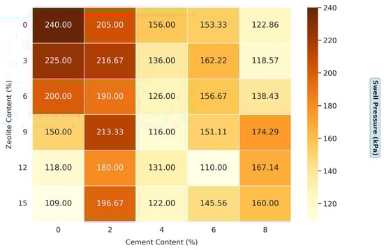 Figure 6 presents a comprehensive dataset on the effects of a varying cement and zeolite content on the swell pressure of soil. This experimental design is particularly robust, systematically exploring a wide range of admixture combinations: the cement content varies from 0% to 8% in 2% increments, while the zeolite content ranges from 0% to 15% in 3% increments. This extensive matrix allows for a nuanced understanding of how these two stabilizers influence soil’s swelling behavior synergistically. For the untreated soil (0% cement, 0% zeolite), the swell pressure is 240 kPa, indicating a high swelling potential that poses significant risks for infrastructure built on such soil. High swell pressures can lead to heave, causing structural damage to foundations, slabs, and pavements. The effect of cement and zeolite on swell pressure reduction is pronounced, suggesting a synergistic interaction. For instance, at 6% cement and 12% zeolite, the swell pressure is reduced to 110 kPa. Several mechanisms can explain this enhanced performance. First, both admixtures provide calcium ions that promote cation exchange and flocculation in clay particles. Second, zeolite’s pozzolanic properties allow it to react with the calcium hydroxide (Ca (OH)2) produced during cement hydration, forming additional C-S-H gels. This supplementary cementitious reaction enhances the soil’s strength and reduces its tendency to swell by creating a denser, more stable soil matrix [40].