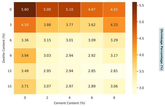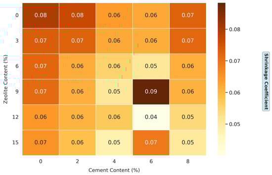 Figure 8 presents a comprehensive dataset on the effects of a varying cement and zeolite content on the shrinkage coefficient of soil. This experimental design is particularly robust, systematically exploring a wide range of admixture combinations: the cement content varies from 0% to 8% in 2% increments, while the zeolite content ranges from 0% to 15% in 3% increments. This extensive matrix allows a nuanced understanding of how these stabilizers synergistically influence soil shrinkage behavior. The shrinkage coefficient for the untreated soil (0% cement, 0% zeolite) is 0.08, indicating a high shrinkage potential. The shrinkage coefficient is a critical parameter in geotechnical engineering, as it quantifies a soil’s volumetric change potential during drying. Higher values suggest greater susceptibility to shrinkage-induced problems such as cracking, differential settlement, and structural damage, particularly in regions with significant wet–dry cycles [45]. Zeolite’s high cation exchange capacity (CEC = 1.1 meq/g) facilitates the replacement of monovalent cations (e.g., Na+) in montmorillonite with Ca2+ from cement, reducing the diffuse double-layer thickness and promoting clay particle flocculation [34,35]. Cement further supplies Ca2+ via hydration, reinforcing this process and stabilizing the soil fabric against swelling (FSI reduction from 45 to 18, Figure 4) and shrinkage (shrinkage coefficient reduction from 0.08 to 0.04, Figure 8).