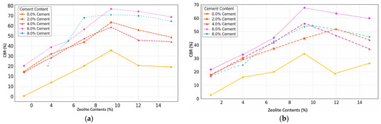 Effects of varying cement and zeolite content of stabilized soil on soaked features: (a) unsoaked and (b) soaked.