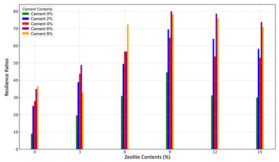 Also, the reduction in swelling potential can be attributed to the cementitious reactions that occur when cement is added to soil, leading to calcium silicate hydrate (C-S-H) and calcium aluminate hydrate (C-A-H) gels. These gels bind soil particles together, reducing void spaces and limiting water’s ingress, thus mitigating swelling [6]. Zeolites are aluminosilicate minerals with a highly porous structure and high cation exchange capacity (CEC). When added to soil, zeolite’s high CEC allows it to exchange its cations (often Na+, K+, or Ca2+) with the cations in the clay, mainly Na+. This ion exchange reduces the thickness of the diffuse double layer around clay particles, leading to flocculation and aggregation. Moreover, zeolite’s porous structure can physically trap water molecules, further reducing the soil’s swelling potential [12]. The traditional lime treatment can reduce the FSI by 40–60% at dosages of 4–8% [37]. Similarly, fly ash has been shown to decrease the FSI by 50–70% at 10–20% additions [38].