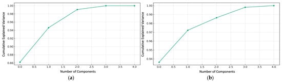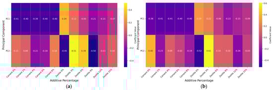 Response surface methodology (RSM) is also frequently used. Ren et al. employed RSM to optimize the geopolymer content for a maximum CBR, achieving an R-square of 0.89 [56]. While effective, RSM models become increasingly complex with more variables, making them challenging to interpret and computationally expensive. Our PCLR approach, by focusing on the most influential principal components, maintains a high accuracy for unsoaked CBR (R-square = 0.935) and unsoaked CBR (R-square = 0.750) while offering a more parsimonious model. Support Vector Machines (SVMs) have gained popularity for their ability to handle nonlinear relationships. Kumar et al. used an SVM to predict the CBR in lime-stabilized soils under soaked conditions, reporting an RMSE of 28% [57]. Our PCLR model has RMSEs of 20% for unsoaked CBR and 25% for soaked CBR. This suggests that the linear combinations in PCLR may capture zeolite–cement interactions more effectively than SVM’s kernel transformations. PCLR’s novelty lies in its dual reduction approach, utilizing only top principal components (94.62% variance for unsoaked, 93.63% for soaked CBR), followed by Lasso’s sparse feature selection, creating a parsimonious model that effectively addresses multicollinearity through orthogonal transformation. Unlike black-box or overly complex models, PCLR provides mechanistic insights, with the high variance explained by PC1, directly informing the dominant zeolite–cement synergies. This model demonstrates consistent performance across moisture states and diverse zeolite–cement compositions, as evidenced by the tight diagonal fit across the CBR spectrum, outperforming more specialized approaches in the literature.