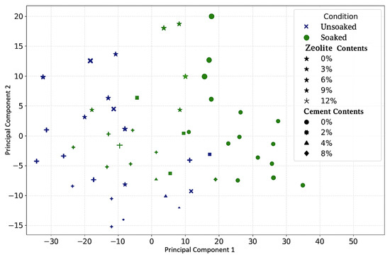 PCLR is an advanced statistical technique that combines the dimensional reduction capabilities of principal component analysis (PCA) with the feature selection and regularization properties of Lasso regression [34]. This method is particularly useful in addressing the multicollinearity and overfitting issues often encountered in complex datasets, such as those in geotechnical engineering [35,36]. PCLR is a hybrid technique that combines PCA with Lasso regression to predict CBR values for both unsoaked and soaked conditions in soil mixtures containing varying proportions of cement and zeolite. The comprehensive analysis of the principal component Lasso regression (PCLR) method applied in this geotechnical study follows: