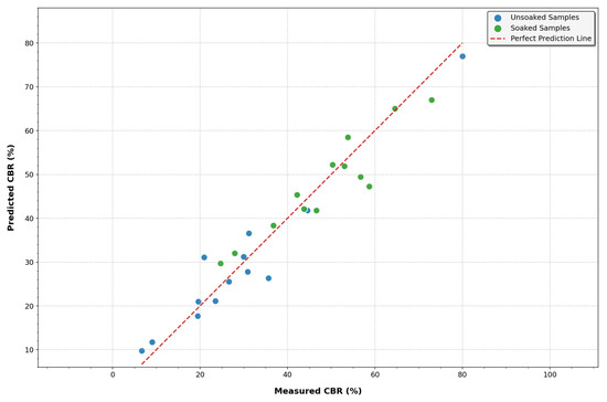 A novel modeling approach, PCLR, was applied to predict CBR values in both unsoaked and soaked conditions for soil mixtures with varying cement and zeolite proportions. This technique synergistically combines PCA’s dimensional reduction with Lasso regression’s feature selection capability, addressing the multicollinearity and overfitting challenges common in geotechnical modeling. Figure 14 illustrates the PCLR’s performance in predicting unsoaked CBR values, achieving an R-square of 0.935 and RMSE of 20%, Figure 14 also demonstrates its effectiveness for soaked conditions, with an R-square of 0.750 and RMSE of 25%. These metrics indicate that the model explains 93.5% of unsoaked CBR and 75% of soaked CBR variability, representing a reasonable accuracy given the inherent geotechnical variability. Alavi et al. used artificial neural networks (ANNs) to predict the CBR in soil–cement mixtures, achieving an R-squared of 0.92 [52]. Moreover, ANNs are often criticized for their “black box” nature, offering little insight into the underlying mechanisms. In contrast, PCLR’s use of principal components provides a clearer picture of the critical interactions driving soil’s strength. Multiple linear regression (MLR) is another common approach. Mohanty et al. applied MLR to model CBR changes with varying fly ash content, reporting an R-squared of 0.85 [55]. This variable likely stems from MLR’s vulnerability to multicollinearity, a problem when dealing with interrelated factors like cement and zeolite proportions. PCLR elegantly sidesteps this issue by transforming correlated variables into orthogonal principal components.