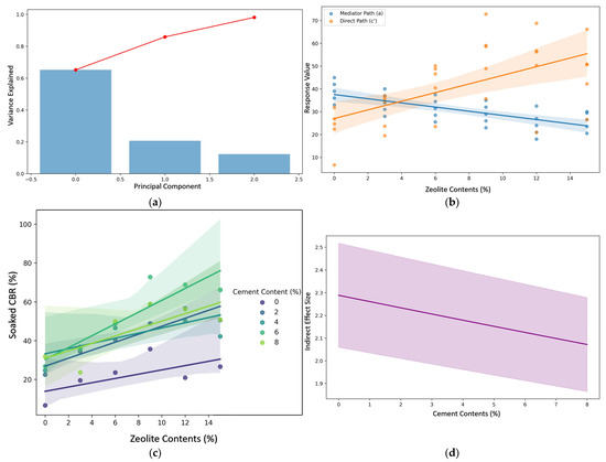 The statistical analyses reveal complex relationships between zeolite content, cement content, free swell index, and CBR in soil stabilization applications. The findings illuminate several important statistical phenomena that merit detailed examination. Figure 15a presents the explained variance ratio of principal components with a 95% threshold. The first principal component accounts for approximately 65% of the total variance, while the second and third components contribute roughly 20% and 12%, respectively. The cumulative explained variance (red line) reaches 95% by the third component, indicating that three principal components are sufficient to capture the essential variance in the dataset. The mediation analysis demonstrates a statistically significant indirect effect of zeolite content on the soaked CBR through the free swell index. The path coefficient from zeolite content to free swell index (a = −0.91429, p < 0.0001) indicates that an increasing zeolite content significantly reduces the free swell index. Concurrently, the path from free swell index to soaked CBR (b = −2.13016, p < 0.0001) reveals that lower free swell index values contribute to higher soaked CBR percentages. The total effect of zeolite content on the soaked CBR (c = 1.894114, p = 0.000492) is significant, whereas the direct effect (c’ = −0.11108, p = 0.810543) is not statistically significant. The indirect effect (ab = 2.005192), with confidence intervals [1.144505, 3.052653] not crossing zero, confirms that the free swell index fully mediates the relationship between zeolite content and soaked CBR. This mediation effect is envisaged in Figure 15b, where the mediator path (blue) shows a negative slope, while the direct path (orange) exhibits a positive slope.