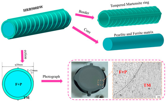 All the experimental steel bars are low-temperature-resistant steel bars with a diameter of 20 mm, and the chemical composition is shown in Table 1. First, the matrix of low-temperature-resistant steel bars was preliminarily characterized, including metallographic, matrix hardness, grain size statistics, X-ray diffraction, and transmission. Then, the axial tensile mechanics test under different ambient temperatures was carried out, the tensile ambient temperature was between 25 °C and −163 °C, and the test ambient temperature error could be controlled at ±2 °C. Then, the microscopic analysis of the tensile fractures of the steel bar at different tensile temperatures was carried out, and the differences between the core and border microstructure under low-temperature deformation were compared and analyzed. In order to facilitate readers to quickly understand the microstructure of the test material, we made a schematic diagram of the microstructure distribution of the 500 MPa steel grade low-temperature-resistant steel bar, as shown in Figure 1. The steel bar is φ20 mm, and the thickness of the border TM ring is 2.6 mm.