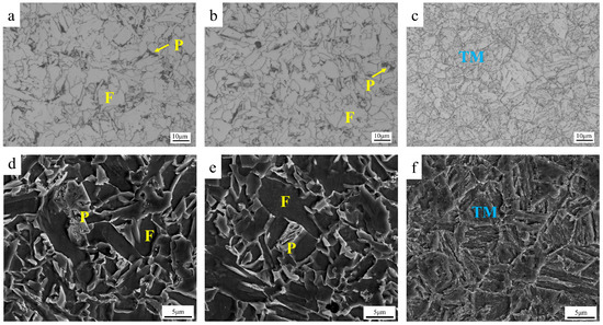 Metallographic microstructure of low-temperature-resistant steel bar. (a,d) Central microstructure; (b,e) 1/2 cardiac microstructure; (c,f) border microstructure.