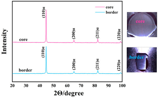 X-ray diffraction technology (XRD-6100, Japan) was used to analyze the phase difference between the matrix microstructure in the core and the border, the center of the cross-section of the rebar sample was selected for the X-ray scanning area of the core, and the rib area of the longitudinal section of the rebar was selected for the border microstructure, so as to ensure the accuracy of sampling. According to the analysis results in Figure 3, the XRD spectrum shows four absorption peaks, which are (110) α, (200) α, (211) α, and (220) α, and the corresponding 2θ are 44.3°, 64.4°, 82.1°, and 100.4°, which confirms that the phase of the core and border of the low-temperature-resistant rebar is mainly composed of the α-Fe phase. The phase composition of iron–nickel, iron–manganese, and iron–vanadium compounds was detected; the atomic radius difference between iron–nickel and nickel was very small, and it was infinitely soluble [24].