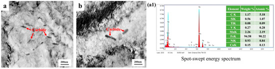 Transmission characterization of low-temperature-resistant steel bar (border). (a,b) precipitated phase of Carbide, (a1) energy spectrum of Carbide.