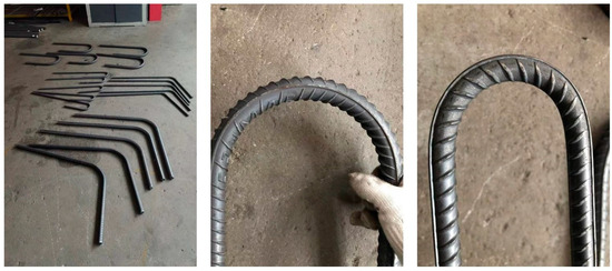 According to the recommended standard of ferrous metallurgy industry of the People’s Republic of China [YB/T 4641-2018], the forward and reverse bending test of low-temperature-resistant steel bars is carried out. After the positive bending is bent 180° according to the specified bending head diameter, no cracks shall occur on the surface of the bending part of the steel bar. The core diameter of the reverse bend test is correspondingly increased by one bar diameter compared to the bending test. In the reverse bending test, the forward bending is 90°, and then, the reverse bending is 20°. After the reverse bending test, no cracks shall occur on the surface of the bending part of the steel bar. As shown in Figure 6 and Table 3, the test results of the forward and reverse bending tests of low-temperature-resistant steel bar are all of acceptable quality.