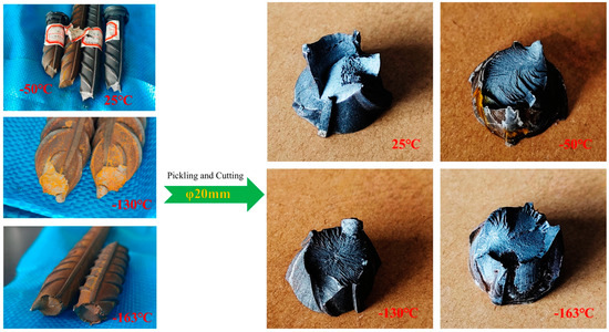 In this paper, the tensile test of low-temperature-resistant steel bars is carried out at four ambient temperatures, namely 25 °C, −50 °C, −130 °C, and −163 °C, where −163 °C is the temperature at which the LNG storage tank stores LNG. The surface of the steel bar in the low-temperature tensile test will be frozen, the tensile fracture is easy to rust, and the fracture observation must be pickled. The tensile fracture is shown in Figure 7. ReL is used as the lower yield strength of the material, Rm is the tensile strength of the material, and the elongation A% after fracture is an important index of low-temperature-resistant steel bars [26,27].