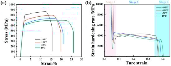 The engineering stress–strain curve in Figure 8a shows that the tensile strength at room temperature 25 °C is 697 MPa, and the elongation after fracture is 26%. The tensile strength at −163 °C is 873 MPa, and the elongation after breaking is 16%. The strain-hardening rate in Figure 8b shows that stage 1 is the linear elastic deformation stage, stage 2 is the molding deformation stage, and stage 3 is the tensile necking stage. The strain-hardening rate represents the stress increment corresponding to the unit strain increment, which characterizes the difficulty of the material to continue plastic deformation. In order to facilitate the comparison of the change in the strain-hardening rate at various temperatures, we do not exclude the elastic strain stage, and the real scope of the strain-hardening rate is defined from the shaping deformation in the second stage. The lower the tensile temperature of the low-temperature-resistant steel bar, the slower it will enter the molding deformation in stage 2. When entering the molding deformation in stage 2, the lower the tensile temperature, the higher the strain-hardening rate is maintained, and the work-hardening effect of −163 °C is significantly stronger than that of 25 °C [28,29]. The following is the formula for calculating the strain-hardening rate of the material. The results are shown in Figure 8b.