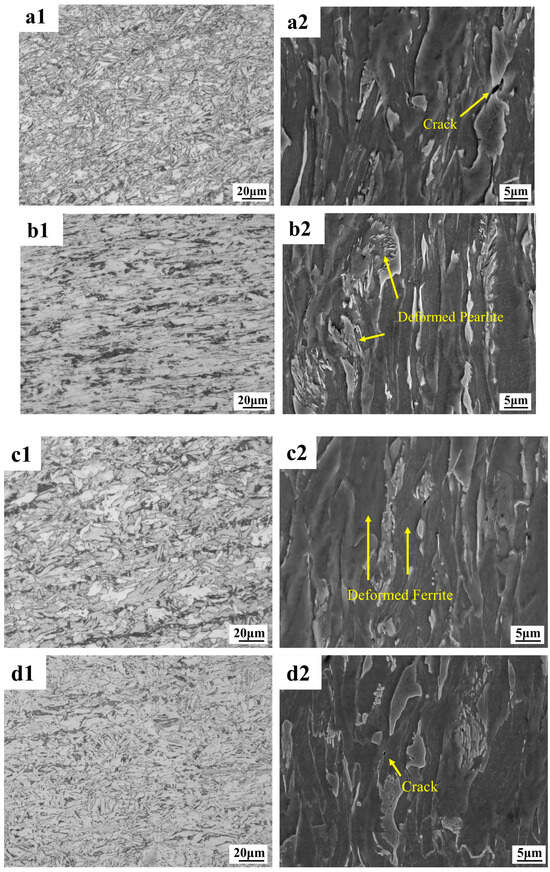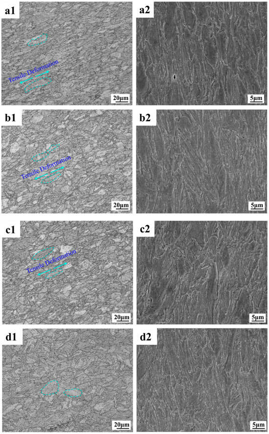 As can be seen from the metallographic and electron microscope scans in Figure 9, the deformation of the F + P microstructure in the core is more intense, and cavities and cracks are prone to appear around the pearlite microstructure. Because the lamellar cementite in pearlite is harder than ferrite, this area is prone to stress concentrations that cause cavities and cracks to appear first. As shown in Figure 10, the border microstructure is relatively uniform, and the probability of cavities and gaps between different grains is lower than that of the core microstructure. From the perspective of the overall degree of deformation, the deformation of the core is higher than that of the border microstructure. Interestingly, under the tensile fracture of −163 °C, the overall deformation degree of the core microstructure is similar to that of other tensile temperatures, but the overall deformation degree of the border microstructure Figure 10(d1,d2) is significantly smaller than that of other tensile temperatures. This shows that the F and P microstructure of the core of the low-temperature-resistant steel bar have good overall deformation ability at different temperatures, while the overall coordinated deformation ability of the border TM microstructure will be significantly reduced at low temperatures.