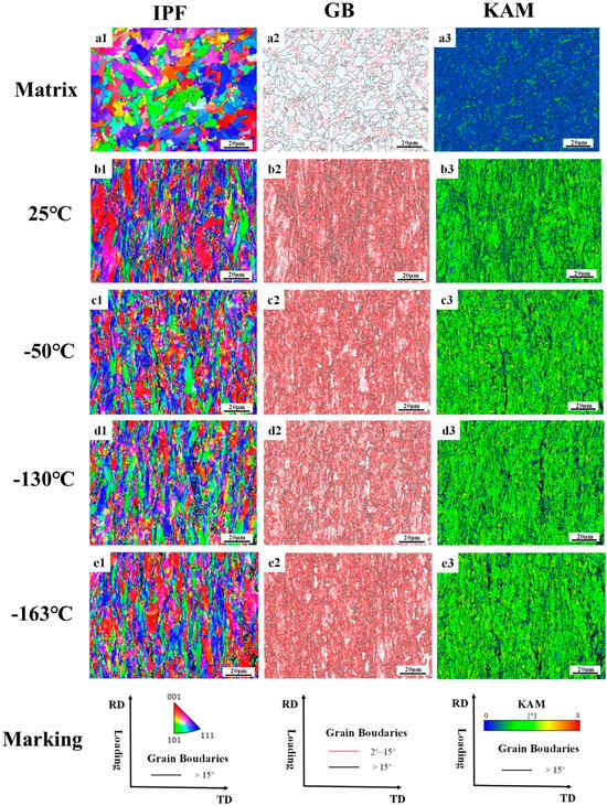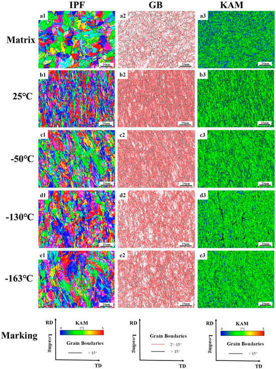 Electron backscatter analysis of tensile fractures of low-temperature-resistant steel bar (core). (a1–a3) Martix, (b1–b3) 25 °C, (c1–c3) −50 °C, (d1–d3) −130°C, (e1–e3) −163°C.
