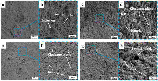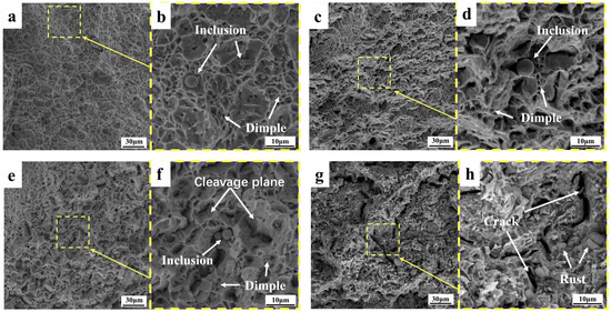 Transmission of fracture microstructure of low-temperature-resistant steel bar (border). (a,b) Matrix; (c,d) 25 °C; (e,f) −163 °C fracture profile direction; (g,h) −163 °C fracture parallel planes.