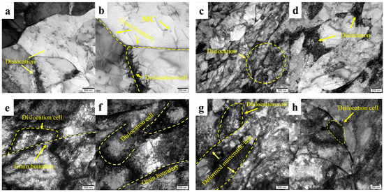 During the deformation process, the stacked dislocations underwent a dynamic recovery, which was rearranged by slipping and climbing to form a more regular dislocation wall. When the steel undergoes plastic deformation, the dislocation density increases significantly, and the dislocations are intersected and entangled with each other, forming a high-density dislocation network. The dislocations are gradually rearranged, forming a cell-like microstructure of low-density dislocation regions (intracellular) and high-density dislocation walls (cell walls). At this point, the cell wall can be regarded as a subgrain boundary (small-angle grain boundary), and its orientation difference is usually less than 15°, but the grain boundary in the traditional sense has not yet been formed. In order to reduce the internal energy of the system, high-density dislocations will annihilate and rearrange near the dislocation entanglement and dislocation wall, and the disordered dislocation microstructure will gradually evolve into dislocation cells to balance the energy of the system [42,43,44].