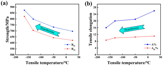 Low-temperature tensile properties of 500 MPa low-temperature-resistant steel bar. (a) Yield strength and tensile strength; (b) elongation and maximum force elongation.