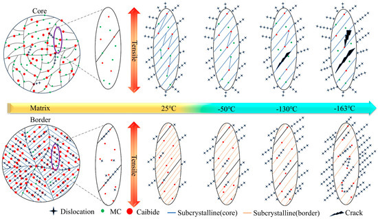 Based on the abovementioned microscopic analysis of fracture at different tensile temperatures, we summarize the deformation laws of core and border microstructure and describe dislocations, precipitated phases, carbides, grain boundaries, and subgrain boundaries in the material matrix. In order to facilitate readers to understand our work more clearly and quickly, we make the model of the deformation of the core and border microstructure of the low-temperature-resistant steel bar in Figure 18 at different tensile temperatures.