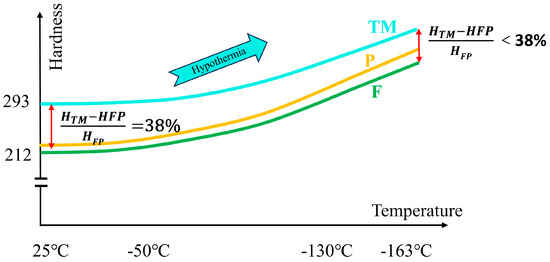 As the ambient temperature decreases, the materials tend to become brittle and hard [60]. At room temperature, the HV0.3 of the heart is 212, and the HV0.3 of the edge is 293. The hardness of the edge is 38% higher than that of the heart. We propose a new concept here. Combined with the tensile deformation mechanism and microscopic analysis of low-temperature-resistant steel bars, the low-temperature environment will make the microstructure in the steel bar harder as a whole, with the largest increase in F, followed by the P structure, and the smallest in TM. The trend of microstructure hardness following temperature is shown in Figure 19. The implication of this concept is that the cold environment will cause the microstructure to harden, but the lower the temperature, the relative difference between the stiffness of the border and the core will decrease. According to the relationship between hardness and force distribution, on the whole, the low-temperature environment is conducive to the overall synergistic force of the core and border materials and slows down the stress concentration effect of the border materials.