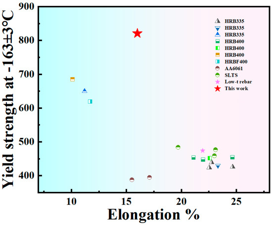 Previously, some scholars did a low-temperature tensile test of steel bars at −163 °C ± 2 °C [10,23,64,65,66], and the steel studied by these scholars was either low in strength or low in elongation, which we summarize in Figure 20. In order to meet the market’s demand for low-temperature strength and toughness of new steels, we designed 500 MPa steel grade low-temperature-resistant steel bars, which can ensure relatively high yield strength and maintain a certain elongation in an ultra-low-temperature environment of −163 °C. We expect that, in our next work, by reducing the thickness of the TM ring, the elongation at ultra-low temperatures will be further improved.