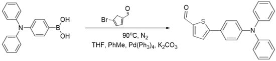 The synthesis of 5-(4-(diphenylamino)phenyl)thiophene-2-carbaldehyde (TPTc) was carried out under the conditions of the Suzuki cross-coupling reaction [16,17,18] between 4-(Diphenylamino)benzeneboronic acid and 5-bromo-2-thiophenecarboxaldehyde according to the reaction scheme in Figure 1.