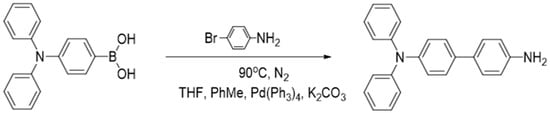 The synthesis of N,N-Diphenyl-4,4′-biphenyldiamine (DBD) was carried out by a Suzuki cross-coupling reaction between 4-(Diphenylamino)benzeneboronic acid and p-bromoaniline using a literature method [19]. The synthesis scheme of DBD was shown in Figure 2.