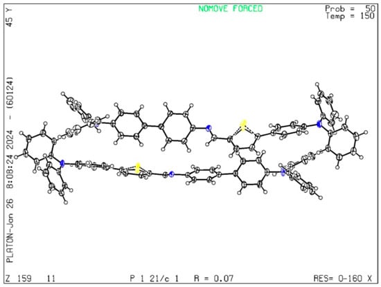 The single crystal diffraction pattern of the TPTc-DBD was measured and the result is shown in Figure 4. The detailed single crystal diffraction data of TPTc-DBD are shown in Table S1. The single crystal morphology of a TPTc-DBD molecule is columnar single crystal with the space group of monoclinic P21/C. There are no solvent molecules which appear in the crystal structure and the sulfur atoms are monoatomic disordered. The crystal structure of TPTc-DBD has been deposited at the Cambridge Crystallographic Data Centre (No. 2401114; deposit@ccdc.cam.ac.uk or http://www.ccdc.cam.ac.uk (accessed on 7 November 2024)).