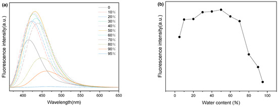 The TPTc-DBD molecule is a triphenylamine derivative, so its aggregation-induced luminescence (AIE) properties [25] were tested. The solution concentration of the TPTc-DBD was 10 μmol·L−1 during the study. The result is shown in Figure 5. The fluorescence intensity of the TPTc-DBD solution showed a trend of increasing and then decreasing with the increase in the volume fraction of water, and the emission wavelengths gradually red-shifted at the same time. The fluorescence intensity reached the maximum at the THF:H2O volume ratio of 50:50, with an emission wavelength of 432 nm, and the fluorescence quantum yield at this time was 43%. Furthermore, the fluorescence intensity decreased rapidly with the increase of H2O volume after the THF:H2O volume ratio reached 30:70, the fluorescence intensity was about half of the initial value when the THF:H2O volume ratio reached 10:90, and the emission wavelength was 461 nm. When the THF:H2O volume ratio reached 5:95, the fluorescence intensity was almost completely quenched. Overall, TPTc-DBD exhibits aggregation-caused quenching (ACQ) behavior, in which the aggregated state is non-fluorescent [26], and the compound exists as a yellow, solid powder at room temperature.