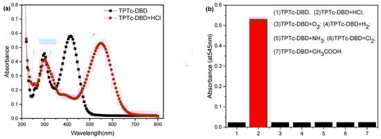 In order to further verify the selectivity of TPTc-DBD molecules for HCl gas, the sensing performance of TPTc-DBD molecules for HCl in acetonitrile solution was tested, and the results are shown in Figure 6. The maximum UV absorption peak of TPTc-DBD was 415 nm, which red-shifted to 545 nm when HCl was added (Figure 6a). Moreover, the color of the solution changed from yellow to purple, which indicated that the TPTc-DBD molecule reacted with HCl. In order to investigate the selectivity of TPTc-DBD molecules to HCl, the effects of Cl2, NH3, O2 and H2, which are several HCl companion gases in chemical production, were also tested [27], as were CH3COOH vapors on the TPTc-DBD molecules for the detection of HCl, with a concentration of 10 μmol·L−1 of TPTc-DBD molecules, with a venting volume of 1 mL for both (Figure 6b). The results showed that the TPTc-DBD molecule has a good selectivity for HCl.