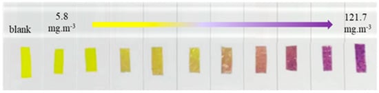 The porous composite films were placed in HCl gas with concentrations of 121.7 mg·m−3, 103.4 mg·m−3, 91.3 mg·m−3, 79.1 mg·m−3, 59 mg·m−3, 47 mg·m−3, 35 mg·m−3, 23 mg·m−3, 12 mg·m−3 and 5.8 mg·m−3, respectively, and the photographs were shown in Figure 8. The results showed that the color of the composite films deepened sequentially with the increase in HCl concentration, gradually changing from yellow to purple. The color of the composite film can remain unchanged at room temperature for several days. It is noteworthy that when the concentration of HCl gas increases, the intensity of the Uv-Vis absorption peak at 417 nm of the composite films gradually decreased, as shown in Figure 9a. These changes can be attributed to the variations in the energy band structure of TPTc-DBD. The molecular planarity of TPTc-DBD molecules increases and the degree of molecular conjugation is enhanced upon incorporation of HCl. The energy band gap calculated by Gaussian 09 B3LYP/6- 31G(d, p) of TPTc-DBD molecules decreases significantly from 2.943 eV to 1.173 eV when bound with HCl, as shown in Table 1.