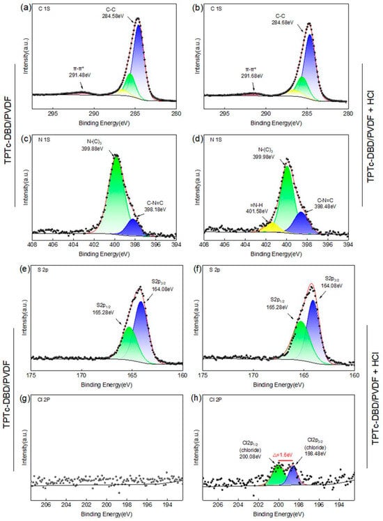 In order to investigate the binding morphology of the composite porous film with HCl, the electronic binding energy of each element of the composite film before and after the adsorption of HCl was characterized by XPS in this study (Figure 10). As can be seen from Figure 10a,b, the electronic binding energy spectra of element C before and after adsorption of HCl on the composite porous film did not change significantly, but the π-π* stacking peak at 291.68 eV was observed in both XPS spectra of element C, which explains the non-fluorescence of the aggregated state of the TPTc-DBD molecules. The electronic binding energy of element S did not change, suggesting that the HCl did not bind with the S atom in TPTc-DBD molecules (Figure 10e,f). While in Figure 10c,d, element N showed a new peak of =N-H at 401.58 eV, which indicated that the H atom of HCl was bound to the N atom in C=N on the TPTc-DBD molecules [28,29,30]. Before adsorption of HCl, no peak for element Cl was observed in the XPS spectrum of the composite porous film (Figure 10g). It is noteworthy that peaks at 200.08 eV and 198.48 eV were observed in the XPS spectrum of element Cl after adsorption of HCl on the composite porous film, and the difference between the two peaks was 1.6 eV (Figure 10h), which is typical of chloride peaks. This is a typical chloride peak. This indicates that the TPTc-DBD molecules on the composite porous film bind with HCl molecules to form a protonated Schiff base–chloride ion pair.