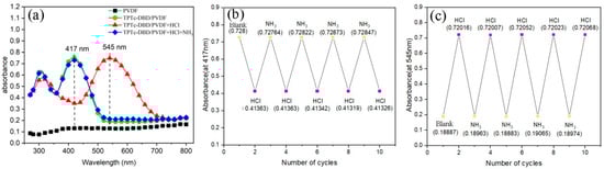 In order to investigate the cyclic detection performance of composite films for HCl gas, NH3 was selected as the desorption gas of TPTc-DBD/PVDF composite films after the adsorption of HCl. Hydrogen chloride (HCl) is an acidic gas, which can bind to the basic sites on the TPTc-DBD molecules in the TPTc-DBD/PVDF composite film, while ammonia (NH3) is an alkaline gas that can recapture the HCl from TPTc-DBD molecules. The Uv-Vis absorption spectra of pure TPTc-DBD/PVDF composite films, TPTc-DBD/PVDF composite films after adsorption of HCl and TPTc-DBD/PVDF composite films after adsorption of HCl and NH3 were tested separately. A total of five film samples were prepared for testing, one at a time. For each sample, the five cycles were performed on the same day with a 1-h interval between each cycle. The result showed that these samples exhibited good reproducibility. The results are shown in Figure 11. In Figure 11a, there is no obvious absorption peak in the range of 300–800 nm for the PVDF matrix. The TPTc-DBD/PVDF composite film exhibits two absorption peaks in the range of 300–800 nm, located at 320 nm and 417 nm, respectively, with the maximum absorption peak at 417 nm and an absorbance value of 0.728. When the TPTc-DBD/PVDF composite film adsorbs HCl, its absorbance value at 417 nm decreases from 0.728 to 0.414. As an alternative, it exhibits a distinct strong absorption peak at 545 nm, with an absorbance value of approximately 0.72, while the pure TPTc-DBD/PVDF composite film has an absorbance value of 0.189 at 545 nm. When the TPTc-DBD/PVDF composite film adsorbing HCl interacts with NH3 again, its UV-Vis absorption spectrum curve almost overlaps with that of the pure TPTc-DBD/PVDF composite film, demonstrating good recyclability. We repeated the process five times and recorded the absorbance values of the TPTc-DBD/PVDF composite film at 417nm (Figure 11b) and 545nm (Figure 11c), respectively. The results showed that after five testing cycles, the absorbance values of the composite film at 417 nm and 545 nm exhibited good repeatability, with a maximum error of only 0.94%. The test was carried out for ten cycles. The result is shown in Figure S9. The absorbance values of the composite film at 417 nm and 545 nm exhibited good repeatability after eight test cycles. Starting from the nineth test cycle, the absorbance values at 417 nm and 545 nm deviated to a certain extent, indicating that the stability of the film decreased to a certain extent at this time, and there was no significant change in the film morphology after ten test cycles (Figure S10). So, it can be seen that the TPTc-DBD/PVDF composite film has a good cyclic detection performance for HCl gas.