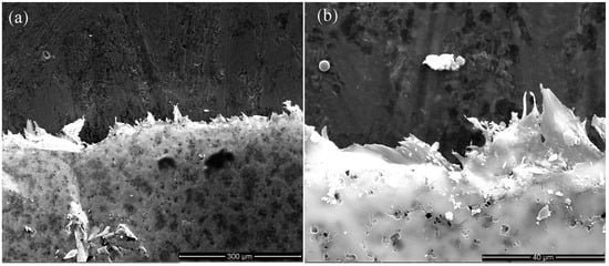 SEM of TPTc-DBD/PVDF composite films after five testing cycles, (a) ×400, (b) ×3000.