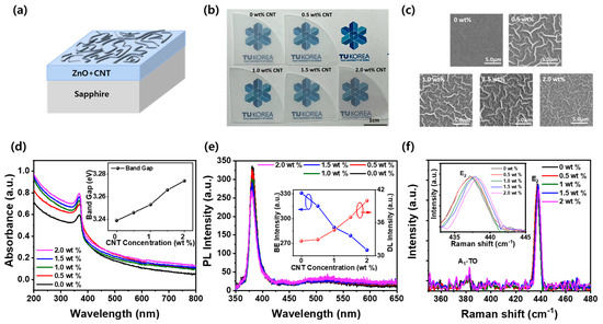 (a) Schematic diagram of ZnO–CNT nanocomposite thin film with surface wrinkle structures. (b) Photographic image, (c) SEM images, (d) UV-visible absorption spectra, (e) PL spectra, and (f) Raman spectra of ZnO–CNT nanocomposite films with different CNT contents (0–2.0 wt%). The insets of (d–f) show the variation in bandgap energy, the intensity ratio of NBE to DLE, and the E2 peak position as a function of CNT concentration, respectively.