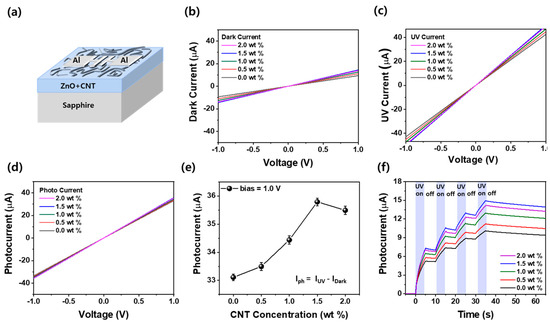 (a) The schematic diagram of the Al/ZnO–CNT/Al device. Current–voltage (I–V) characteristics of Al/ZnO–CNT/Al devices under (b) dark and (c) UV illumination conditions for various CNT concentrations. (d) Photocurrent extracted by subtracting dark current from UV current (Iph = IUV − Idark) at 1.0 V. (e) The photocurrent obtained at 1.0 V as a function of the CNT concentration in ZnO–CNT film. (f) Time-dependent photocurrent response under four cycles of UV on/off (5 s on, 5 s off).