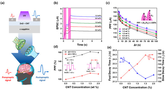 Figure 3a illustrates a conceptual diagram of the Al/ZnO–CNT/Al optoelectronic synaptic device, where UV light serves as a presynaptic stimulus that generates a postsynaptic signal (EPSC) through photogenerated carrier dynamics in the ZnO–CNT layer. Upon UV irradiation, electron–hole pairs are generated in ZnO, and the p–n heterojunction formed with p-type CNTs facilitates efficient charge separation, leading to an enhanced EPSC. To evaluate the short-term synaptic plasticity characteristics of the ZnO–CNT nanocomposite optoelectronic synaptic devices, paired-pulse facilitation (PPF) experiments were performed under UV light stimulation. Figure 3b presents the EPSC responses of the devices to two consecutive UV pulses, each with a width of 0.5 s and a 50% duty cycle. The applied voltage was fixed at 1.0 V for all measurements. As CNT content increases, the EPSC improves, reaching a maximum at 1.5 wt%, where optimal charge separation and transport pathways are achieved. However, at 2.0 wt% CNT, the EPSC slightly decreases due to CNT aggregation, which introduces recombination sites and impedes uniform transport. In this setup, the first UV pulse induces a baseline EPSC (denoted as A1), followed by a second EPSC (A2) in response to the second pulse. The PPF index was calculated using the following equation [37,38]: