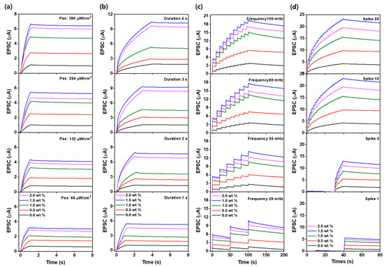 EPSC response and retention characteristics under varying (a) UV light intensity (66–396 μW/cm2), (b) pulse durations (1–4 s), (c) pulse frequencies (20–100 mHz), and (d) the number of UV pulses (1–20 spikes).