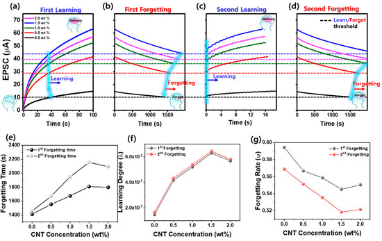 where P is the light output density (396 µW/cm2), A is the illumination region (channel length: 50 µm × width: 825 µm), t is the pulse duration (0.5 s), and α is the ZnO absorption rate (0.20). Using this equation, the absorbed energy per UV pulse was estimated to be approximately 16.34 nJ. Although this energy level is slightly higher than that of biological synapses (typically ~10 fJ to a few nJ per event), the relatively large device size used in this study suggests that miniaturization could enable ultra-low power operation, bringing energy consumption into the biologically relevant regime. The forgetting process was initiated by UV termination, and the decay of EPSC was monitored over time. This learning–forgetting cycle was repeated twice to evaluate the temporal dynamics and retention behavior across different CNT concentrations. During the first learning phase (Figure 5a), the EPSC increased gradually under 100 UV pulses and reached its peak at 1.5 wt% CNT, indicating the strongest synaptic potentiation. In addition, the number of UV pulses required to reach the maximum EPSC in the first cycle gradually decreased with increasing CNT content, highlighting the role of the CNTs in accelerating synaptic strengthening. The maximum EPSC achieved at each CNT concentration, which gradually increased with CNT content and reached a saturation value of 63.3 μA for 1.5 wt% CNT, is also included in Figure 5a. In the first forgetting phase (Figure 5b), the time required for the EPSC to decay to 70% of its peak value increased with CNT content, reaching a maximum of 1810 s at 1.5 wt%, indicating stronger memory retention due to enhanced charge trapping and suppressed recombination. The forgetting times, which correspond to each CNT content, are also plotted in Figure 5e. The second learning phase (Figure 5c) began from the forgetting threshold levels (blue, magenta, green, red, and black dot lines), and the number of pulses required to recover maximum EPSC decreased with increasing CNT content. This trend, which demonstrates improved relearning efficiency due to residual carrier accumulation, is also reflected in the CNT-dependent learning pulse comparison shown in Figure 5a,c. As shown in Figure 5d, the second forgetting phase also exhibited extended memory retention, similar to the first forgetting cycle. Moreover, as shown in Figure 5e, the forgetting time after the second learning cycle increased for all CNT concentrations compared to the first cycle. In particular, the ZnO-only device showed an increase of approximately 60 s (1460 s), while the 1.5 wt% CNT device showed a 345 s increase, reaching 2155 s, confirming that repeated learning enhances long-term memory retention. This forgetting time (1400–2155 s) is notably longer than those of many previously reported optoelectronic synaptic devices based on materials MoS2, Ga2O3, CNTs, ZnO, and perovskite, which typically range from 10 to 900 s [37,38,39,41,42,43,44,45]. Such extended retention is attributed to the combined effects of persistent photoconductivity and CNT-induced deep-level trap states that suppress recombination and prolong charge storage. These results collectively demonstrate that both short-term and long-term plasticity in ZnO–CNT optoelectronic synaptic devices can be finely tuned by adjusting CNT concentration and that iterative optical stimulation significantly strengthens memory characteristics through cumulative charge retention and persistent photoconductivity enhancement. Furthermore, based on the learning and forgetting response curves shown in Figure 5a–d, Wickelgren’s power law was employed to quantitatively analyze the forgetting behavior of the Al/ZnO–CNT/Al optoelectronic synaptic devices. This model, widely used to describe biological memory decay, is expressed in the following Equation [46,47]:
