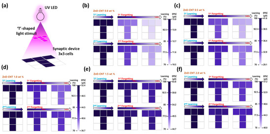 Visual memory simulation of ZnO–CNT optoelectronic synaptic devices under patterned UV stimulation: (a) Schematic of the selective UV stimulation process used to project a T-shaped pattern onto a 3 × 3 array of ZnO–CNT synaptic devices. Learning and forgetting behavior of devices with different CNT concentrations: (b) 0 wt%, (c) 0.5 wt%, (d) 1.0 wt%, (e) 1.5 wt%, and (f) 2.0 wt%. The measured EPSC values are mapped to pixel intensity and color to encode the optical memory state across the array.