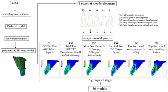Based on data from a previous pilot study [42], dentin thickness measurements from intraoral images of IMIs in children aged from 7 to 11 years were used to reconstruct the five stages of root development: half root development (S1), three-quarter development (S2), more than three-quarter development (S3), fully developed root with open apex (S4), and fully developed root with closed apex (S5). In the next step, a complicated oblique crown fracture involving the loss of more than half of the crown was simulated, where intracanal retention can be considered. The overall therapeutic approach simulated a post-endodontic treatment with intracanal retention and a minimally invasive composite restoration of the crown (Figure 1). The depth of post space preparation varied according to the stage of root development, with the main requirement being to leave 4 mm of gutta-percha in the apical portion of the root. The models were divided into experimental groups according to the type of post system used: GC Fiber Post (GC, Tokyo, Japan) (PS1); RelyX Post (3M ESPE Deutschland GmbH, Seefeld, Germany) (PS2); Metal Post Unimetric 1.0 (Dentsply, Ballaigues, Switzerland) (PS3); everStick Post (GC, Tokyo, Japan) (PS4); positive control group with only the gutta-percha filling (PC), and intact maxillary incisor as negative control group (NC) (Figure 2).