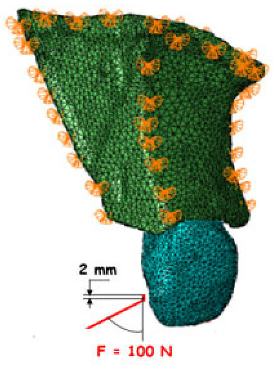 All directional movements were constrained to accurately simulate the anatomical connection with the rest of the maxilla. A static load of 100 N [46,47,48] was applied as a proportional continuous load to a small palatal surface of the simulated tooth at a 45-degree angle (Figure 3). The resulting equivalent stresses were evaluated using the Hencky–von Mises (HMH) stress theory.