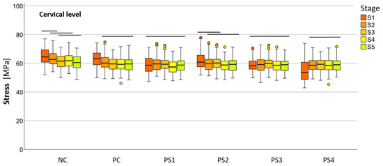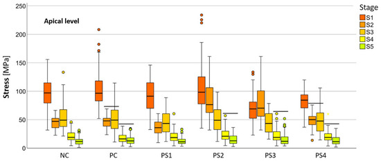 The mean HMH stress within the root dentin was statistically significantly higher at the cervical level in all stages, except in stage S1 and in models PS2 and PS3 in stage S2, where it was significantly higher at the apical level (p < 0.001 for all models, except stage S3 [PC model p < 0.005; NC model p < 0.008]) (Table 2). The PS4 model showed the lowest stress values at the cervical level in stages S1 (55.19 ± 1.70 MPa), S2 (58.78 ± 0.93 MPa), and S3 (58.84 ± 1.04 MPa), while the PS1 model showed the lowest values in stages S4 (57.48 ± −1.03 MPa) and S5 (58.81 ± 1.08 MPa). At the apical level, the lowest stress values were observed in the PS3 model at stage S1 (69.60 ± 5.03 MPa), in the PS1 model at stages S2 (35.99 ± 2.63 MPa), S3 (44.30 ± 4.07 MPa), and S5 (12.51 ± 1.42 MPa) and in the PC model at stage S4 (17.85 ± 1.88 MPa). Stress within the root dentin showed a decreasing trend from stage S1 to stage S5 in most models at both levels. However, notable deviations were observed in the PS1 and NC models, where stage S2 at the apical level exhibited significantly lower stress than stage S3, in the PS3 model, where stage S1 at the apical level exhibited significantly lower stress than stage S2, and in the PS4 model, where stage S1 at the cervical level exhibited significantly lower stress than stage S2 and all subsequent stages. In general, no statistically significant differences were observed between the post systems at both levels for all stages, especially for the stages with the highest clinical relevance (S4 and S5) (Table 3).