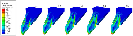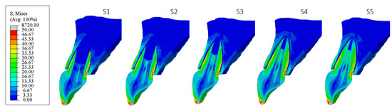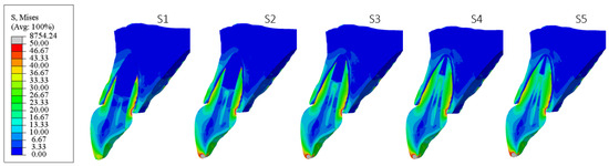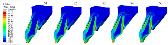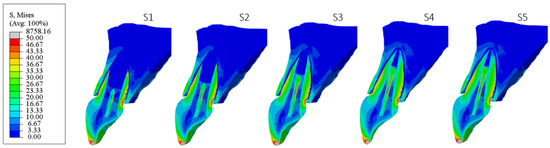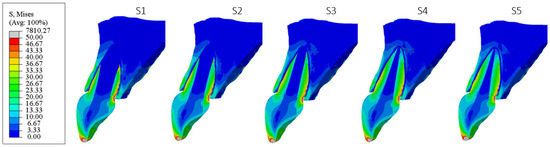 Comparison of stress concentrations in root dentin between developmental stages within each group in our study showed a decrease from S1 to S5, as expected given the progressive thickening of the dentin wall at each subsequent stage. The deviations observed in stages S2 and S3 can be attributed to differences in the modeling of these stages based on our pilot study [42]. In particular, a value corresponding to two-thirds of root development was used for stage S2, whereas a range between S2 and S4 (more than two-thirds of development) was applied for stage S3, which may have contributed to greater variability in the modeling.