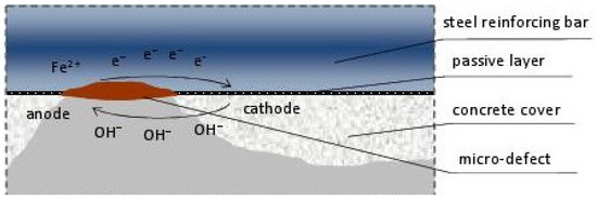 Schematic diagram of the electrochemical corrosion process of reinforcement in concrete.