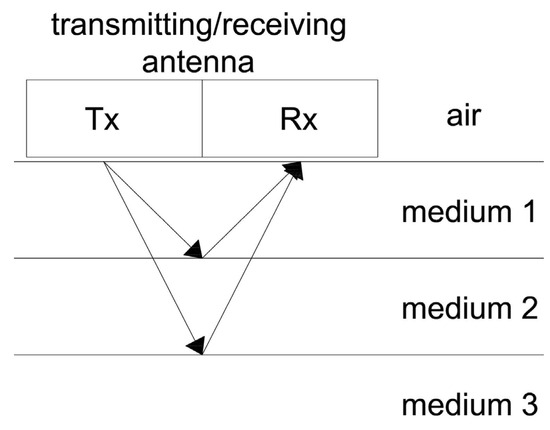There are different variants of how measurements are conducted, but in structural engineering investigations, reflective profiling is almost always used. A schematic diagram of this type of measurement is shown in Figure 2. The transmitting and receiving antennas are simultaneously moved across the surface of the studied material. The transmitting antenna sends an electromagnetic pulse into the medium. This signal, upon encountering an object/obstacle, is reflected and recorded by the receiving antenna. The wave reflected from the object is characterized by particularly high amplitude, and its analysis allows for assessment of the internal structure of the tested medium.