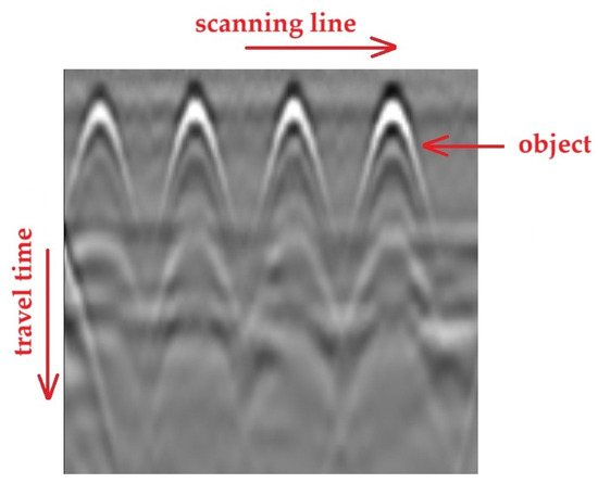 A combination of adjacent traces (A-scans) allows for the creation of a B-scan (Figure 4), where the vertical axis, as previously, represents the time/depth scale, the horizontal axis corresponds to the antenna’s travel path, and the amplitude values are represented using the adopted color scale.