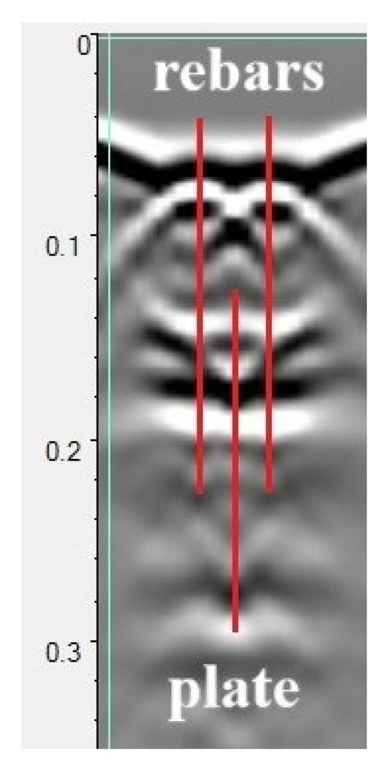 The A-scans recorded directly above the reinforcement bars and in the middle of the distance between them were analyzed, as shown in Figure 7. The external vertical lines represent the paths (A-scans) used to analyze the parameters of the wave reflected from the reinforcement bars. The central line represents the path used to analyze the wave reflected from the plate beneath the sample. In turn, the parameters of the surface wave were read from all three A-scans marked below.