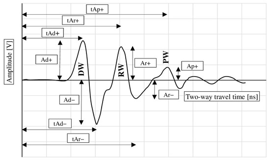 Measured GPR wave parameters: DW—surface wave, RW—wave reflected from the reinforcement, PW—wave reflected from the metal plate placed under the sample.