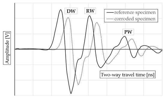 The effect of the corrosive degradation of the tested samples on the reflected wave parameters: DW—surface wave, RW—wave reflected from the reinforcement, PW—wave reflected from the metal plate placed under the sample.